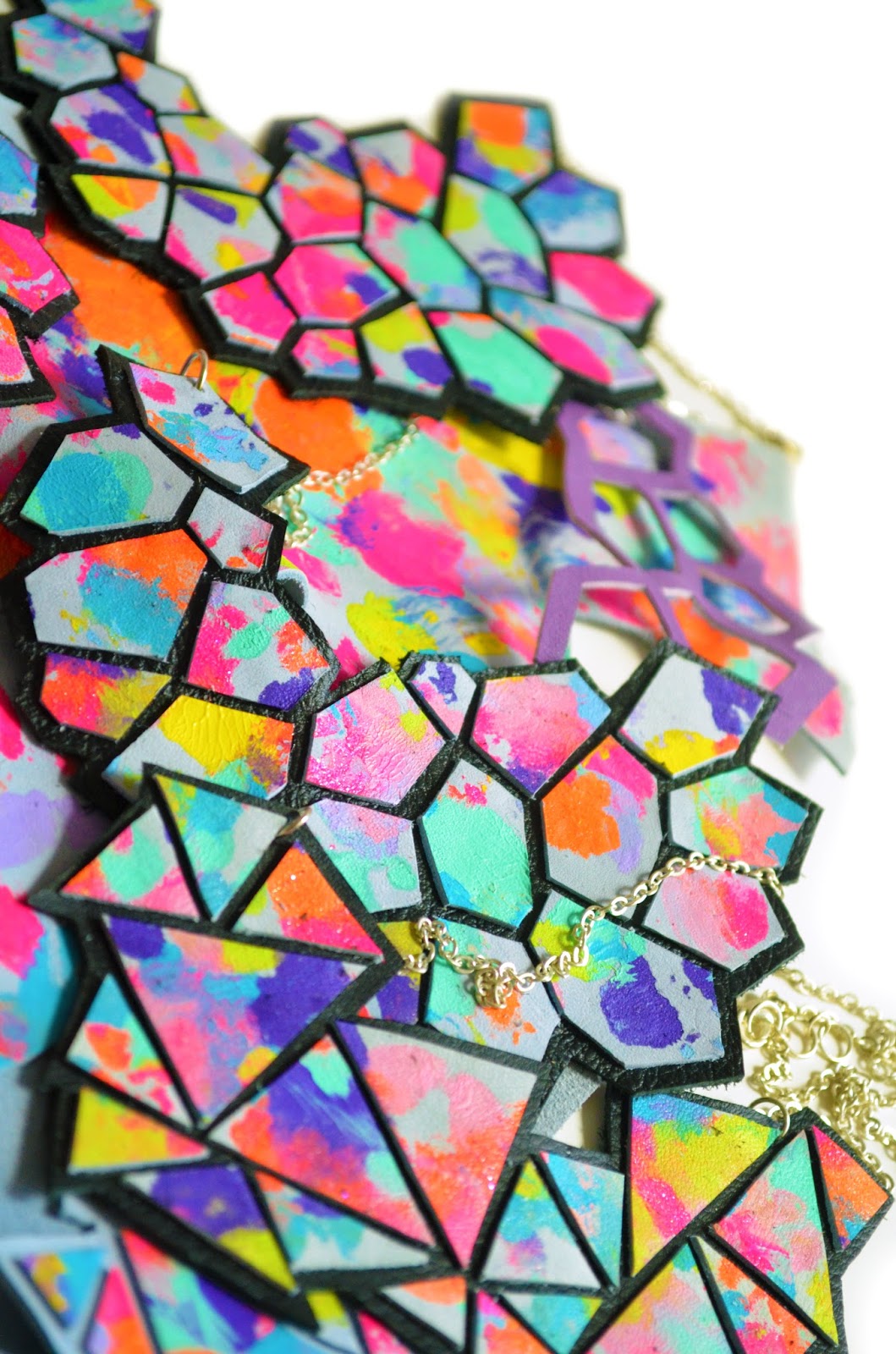 I am working on a few exciting wholesale orders at the moment. This batch of hand cut triangle leather necklaces are like looking into a kaleidoscope of color. I could not resist photographing all 10 necklaces together. My desk, hands, clothes and even my hair are covered in paint!